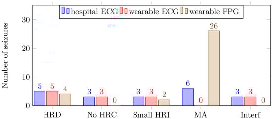 The number of missed seizures for the hospital ECG, the wearable ECG and the wearable PPG were 20, 14 and 32, respectively. In Figure 4, the number of and reason for missed seizures are shown for the three different recording systems.