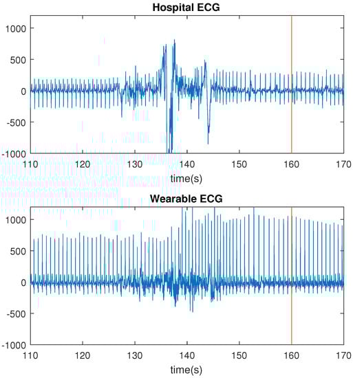 Comparison of motion artifacts: hospital electrocardiography (ECG) and wearable ECG (red line indicates annotated seizure start).