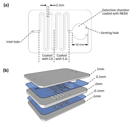 Microfluidic chip for nitrate detection. (a) Chip design where a 1 mm × 2 mm spiral channel with one inlet is connected to a final detection chamber; (b) microfluidic chip layers.