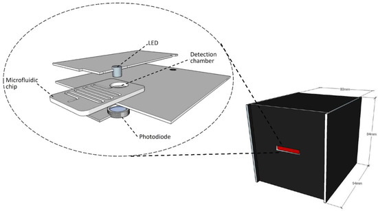 In this work, a simple and cost-effective colorimetric detection setup that can read the final reaction results directly from the detection chamber has been designed and developed. The developed detection setup can facilitate the main goal of the development of a simple, portable, on-site, and cost-effective method for the detection of chemical compounds. Figure 2 shows a 3D view of the proposed detection setup. The main setup is located inside a black semi-cubic box that is 80 mm, 84 mm, and 90 mm in dimension. This black cover has a slot in the front wall for the microfluidic chip to slide in for the final result-reading process. The box is made of 3-mm PMMA sheets and painted black. The inside view shows that the used detection setup consists of three layers: a top layer with a green LED (light-emitting diode) (Farnell, Aschheim, Germany) emits light in the 520–530 nm wavelength range through the detection chamber. The bottom layer is made with a photodiode (Farnell, Aschheim, Germany) which is aligned directly under the LED for light observation and analysis. Finally, the middle layer is made of a specific design to hold and align the detection chamber exactly between the LED and photodiode. For signal read-out and display, Arduino mega, along with LCD shield were utilized. The Arduino was also used as a power source for the LED and the photodiode. For each test, the utilized Arduino takes the voltage signal of the photodiode and displays it on the LCD screen. It was also programmed to display the average of 100 readings each 5 s. Elevation of the nitrate concentration decreases the amount of light transmitted to the photodiode and, as a consequence, the corresponding electrical signal-voltage in this case—decreases. With that, the absorbance (or the transmittance) is correlated to the measured nitrate concentration.