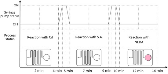 The novel microfluidic design which was discussed earlier eliminates the need for any valving or gating elements to perform the chemical reaction. Instead, the design simply requires a pumping method (using syringe pump in our case) to drive the sample through the microfluidic channel while accurately controlling the flow rate. Figure 3 shows how the experimental process works step-by-step. The upper part of the graph presents the syringe pump status over time as it changes from OFF (no liquid flow) to ON (pump the liquid to the next part of the chip). Under each pump status, the process status and liquid position is presented. For the first time cycle (0 min to 4 min), the syringe pump is OFF and the sample is located within the first part of the chip, which is coated with Cd. Afterward, syringe pump is activated for 1 min to drive the sample from Cd-coated part to S.A.-coated part. It can be noted that we implemented a low flow rate to allow for accurate liquid flow control without the need for the integration of valving mechanism. At 5 min, the pump is deactivated and liquid is allowed to react with the S.A. coating for 4 min. At 9 min, the pump is activated again to drive the liquid to its final destination (the detection chamber). In the detection chamber, the liquid reacts with the NEDA coating for 4 min, where liquid color turns pink. At the end of the reaction time, the pink color intensity presents the concentration of nitrate compounds in the processed sample. The microfluidic chip is then slid into the detection setup for the final result reading. The results will be displayed and saved on a PC dedicated for this process.