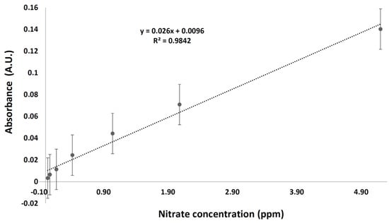 The reported results point to the total nitrate concentrations, including nitrate (NO3−) and nitrite (NO2−). The nitrite content could be estimated if the experiments were repeated without the utilization of cadmium, which is responsible for the nitrate to nitrite reduction. The detection conditions could be improved with the utilization of a glass light transparent cover that transmits the incident radiations more efficiently than the PMMA used in this work; with that, adherence to Beer’s law could be expected in a manner more linear than that shown in Figure 4 (i.e., at R2 = 0.9842).