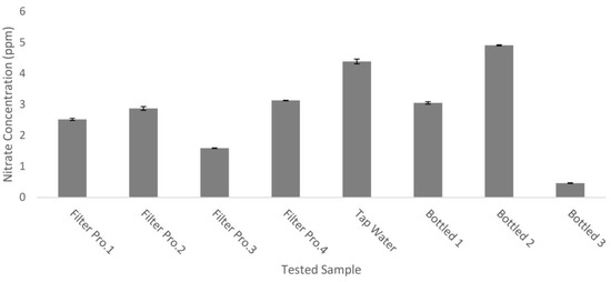 The nitrate content in each sample was measured six times, and the listed results present the average nitrate content in the water samples. As shown in Figure 5, the nitrate content is below the MCL value. Unexpectedly, the maximum reported nitrate content is that of a bottled water sample (Bottled 2), which is even higher than that of the tap water. That reported, and unexpected, value could be attributed to missing key step during course of the purification, which is the anions removal process, allowing nitrate along with other anions to exist as species dissolved in the aqueous matrix with relatively high concentrations. The home-filter treated waters demonstrated moderate nitrate concentrations. The obtained results are of acceptable credibility, since the lowest detected nitrate concentration (Bottled 3) is almost twice as high as the limit of quantification.