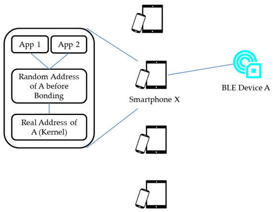 Since privacy has become a critical issue in smartphone applications, current smartphone platforms have started to prohibit smartphone applications from obtaining sensitive information, such as a smartphone’s physical identification, which may result in potential individual privacy disclosure. For example, after Android 6.0 [1], if Android applications invoke the BluetoothAdapter.getAddress() method to get the Bluetooth hardware address of a smartphone, the applications will receive a constant value of 02:00:00:00:00:00 instead of the complete address value. Moreover, to prevent user smartphones from being tracked by malicious adversaries using smartphone Bluetooth Media Access Control (MAC) addresses, a useful technique, called BLE random address, is adopted on smartphones [2,3]. That is, the smartphone will adopt different Bluetooth MAC addresses to communicate with nearby BLE-based devices when the smartphone restarts its Bluetooth function. After a device has been paired with another device with the BLE random address scheme, the device will then transfer the original Bluetooth MAC address and associated identification data to another device. After that, when the device picks up a new Bluetooth MAC address during the next session, the linked device can use the information to resolve the new address into the original one. Note that a device may still give random addresses to paired devices rather than its original address for privacy considerations [3]. However, if a device does not provide its original address to paired devices, the device may need to execute the pairing process again.