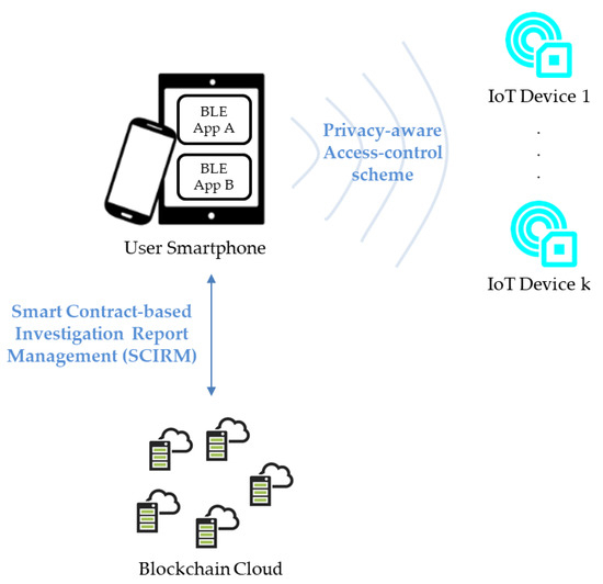 Because the pairing process plays an important role in the BLE-based authentication process for preventing Man-In-the-Middle (MITM) attacks and providing communication security, BLE applications without pairing would increase security risks on the smartphone (and to its owner). Therefore, in this study we first present the generalized requirements BLE-based applications associated with IoT devices. From the viewpoint of IoT devices, to pursue the best tradeoff between privacy and security, we demonstrate a privacy-aware access control scheme for BLE-based IoT devices. Since in our scheme BLE-based IoT applications can constrain an authorized person to use a specific smartphone to access IoT devices without revealing the smartphone’s physical identification information, the proposed method can contribute to alleviate the tension between security and privacy on BLE-based IoT applications. Moreover, from the viewpoint of a smartphone application associated with the IoT objects, we propose a Smart Contract-based Investigation Report Management (SCIRM) framework for the security management of BLE-based applications. The SCIRM enables smartphone application users to obtain security inspection reports of BLE-based applications of interest with smart contracts. Benefiting from blockchain technology, users can obtain historical inspection reports of a BLE-based application and verify the integrity of the reports. In addition, SCIRM utilizes smart contract technology to implement the interfaces so that smart contracts will enforce the related actions automatically. The presented framework can enable users to adopt appropriate countermeasures to potential application security risks as users can obtain up-to-date security information about applications in a timely way. In brief, in this study we introduce a robust security paradigm, as shown in Figure 2, for BLE-based smart objects in the IoT in which two viewpoints on IoT device security and smartphone applications security, respectively, are the focus. The contribution of this manuscript is twofold: one is a privacy-aware access control scheme for secure communication between the smartphone and BLE-based IoT devices and the other one is the SCIRM for the security management of BLE-based applications.