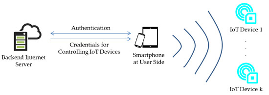 Malicious users may obtain identification information and associated credentials if smartphone owners jailbreak their smartphones and accidentally install malware on the smartphones. Then, the malicious users can adopt faked identification information to access IoT devices. To address the issue, smartphone users may store credentials in the security elements (SEs) of their smartphones and only perform operations regarding credentials in the SEs. Obviously, the biggest limitation of the scheme is that not every smartphone has built-in SEs. Moreover, when users wish to communicate with IoT devices, the users can request remote servers to send one-time-passwords (OTPs) to user smartphones via SMS messages. However, users may not be able to receive SMSs if their smartphones do not install SIM cards. Also, users may need to pay extra costs to receive SMS messages. Even when the servers send OTPs to users through e-mails rather than SMS messages, the IoT devices need to synchronize with the servers.