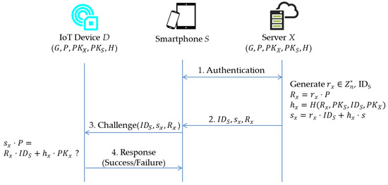 - Setup: server X generates a group G of elliptic curve points with prime order n and determines a generator P of G. Then, X chooses a master key and a secure hash function . Next, X calculates a master public key , and publishes system parameters, i.e., . On the other hand, given , the smartphone S picks a random number as it’s own secret value and computes as the corresponding public key. During system initialization, a set of system parameters, i.e., , are installed into each IoT device associated with server X.