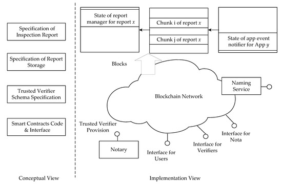 The implementation view illustrates the physical components of the framework. We deploy the framework on the Ethereum blockchain system [29]. In the Ethereum blockchain system, people can enclose data in transactions. The blockchain system encapsulates the transactions in blocks. Due to the size limits of a transaction, this study requests a verifier to split an inspection report into several chunks and enclose the chunks into different transactions. The report manager is to manage the inspection reports. When a verifier submits an inspection report to the blockchain, the verifier obtains the compiled byte code of the report manager and creates a new instance of the report manager smart contract. The verifier can then bind the contract to the transactions of the inspection report. As depicted in Figure 5, the Ethereum blockchain system stores the state of each contract in blocks. After a verifier has created a report manager smart contract for an inspection report, people can obtain the state of the contract from a block in the blockchain system and use the state information to find associated transactions storing the chunks of the report. In addition, we define the application event notifier smart contract. A notary can create an application event notifier smart contract for an application. Verifiers can then link the report manager smart contract of the application to the application event notifier smart contract. Therefore, users only need to listen to the application event notifier smart contract to obtain events that an inspection report of the application has been created or obsoleted.