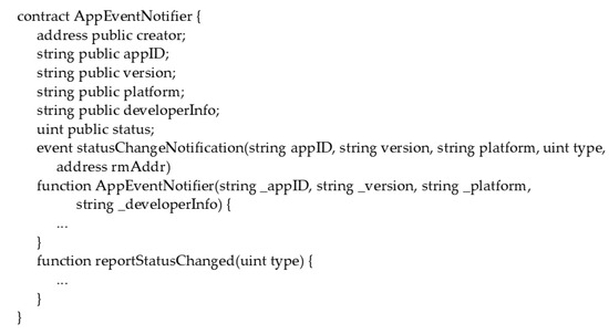 Before introducing the report management smart contract, this study will first introduce the application event notifier smart contract. Figure 6 illustrates the abstract interface of an application event notifier smart contract. An application event notifier smart contract contains profiles of a smartphone application. In addition, it provides the reportStatusChanged interface for the associated report manger smart contract to inform the application event notifier smart contract that the creator of the report manger has just updated the state of the related inspection report. Consequently, interested people can obtain update events for an inspection report. In this case, SCIRM provides the following types of update events for an inspection report: