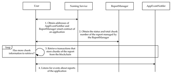 Figure 9 illustrates the process for a user to retrieve inspection reports of an application from a blockchain. When a user downloads a smartphone application from a marketplace, the user can first query the naming service to obtain the address of the AppEventNotifier smart contract of the application as well as the addresses of associated ReportManager smart contracts. Then, for each ReportManager smart contract, the user can obtain the status of the associated inspection report and the verifier to determine whether or not to download the report. If the user decides to download the report, the user can reassemble the report by collecting all the chunks stored in the transactions. Finally, the user can listen to the AppEventNotifier smart contract of the application for status changing events of the application inspection reports.
