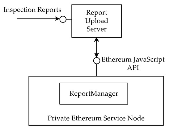 To prove the concept of the proposed framework, we have implemented a prototype system and performed simulation experiment. As shown in Figure 10, we use Node.js to implement a Report Upload Server to handle inspection report uploads. In addition, this study launches a private Ethereum network with a single service node. The report manager communicates with the node via the Ethereum JavaScript API. After receiving an inspection report, the report upload server will split received reports into chucks (Step 1), store the chunks in transactions (Step 2), and send the transaction to the node (Step 3). Next, the report upload server creates a report manager smart contract and sends the addresses to the contract (Step 4).