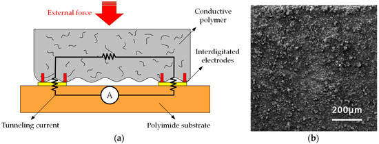 (a) Cross-sectional view and operational principle of the tunneling sensor; (b) SEM image of the contact surface of interlocked microdomes.
