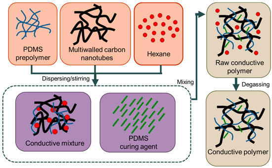 The preparation of conductive prepolymer used in the proposed sensor array is shown in Figure 3. MWCNTs with diameters of approximately 20 nm and lengths ranging from 10 to 50 μm are distributed in hexane and PDMS prepolymer whose CNT concentration is 6 wt % in a ratio of 4:1. The mixture is thoroughly stirred using a magnetic stirrer for 2 h. The hexane is utilized as the dispersant for enhancing the fluidity of the PDMS prepolymer and improving the mixture uniformity during blending. A curing agent is subsequently mixed with the prepolymer in a 10:1 ratio, and the mixture is stirred for another 30 min. In the end, the MWCNT–PDMS prepolymer is degassed in a vacuum chamber for 30 min to evaporate the volatile hexane [15,22].