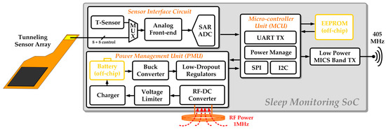 Another challenge of system design is the very limited module size. Because the whole system with all the on-board components and sensor array will be integrated and embedded in an oral appliance, the module has to be sufficiently compact to fit in the available space. System-on-a-Chip (SoC) technology, which has characteristics of small size, multi-sensing, the capabilities of wireless communication and inductively charging, has been widely adopted to solve this problem in recent years [16,17]. All the function blocks required by the system can be specifically designed and merged on a single chip to optimize system performance and reduce the total size and power consumption. Power consumption is also seriously concerned, especially in a continuous sleep monitoring system of 8-straight-hour operation. Therefore, a specifically designed SoC with a power management unit (PMU) is employed on the prototype module for function demonstration.