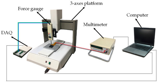 The key task of this system is to accurately detect the tongue position and record data on the timeline basis. The over time record of intraoral activities is indispensable to adjust physical structure of the device for fitting the requirement of each patient specifically [35,36]. First, the tunneling resistance of a stand-alone sensor array will be characterized by incremental forces. Figure 5 illustrates the experimental setup for the incremental force testing. A force gauge with a maximal resolution of 1 mN is used to deliver the applied force, where it is fixed on a 3-axes translational platform that has a vertical (Z-axis) displacement resolution of 1 μm. A circular cross-sectional rod of the force gauge presses the device under test, and the quantity of applied force is determined by the total vertical displacement. The resistance variation of each tunneling sensing cell is measured using a multimeter and recorded by a computer. Next, an actuator driven by a function generator will be utilized to give a periodical pressing for 7200 cycles in an hour to evaluate the dynamic response and repeatability of the sensor.