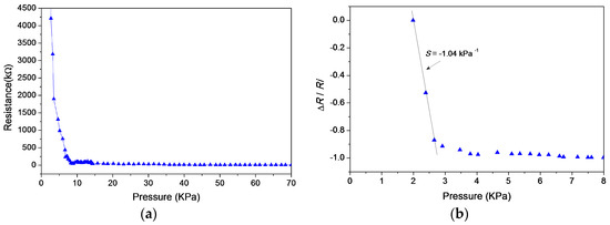 (a) Measured piezoresistive response of the tunneling sensor; (b) Normalized measured response under 8 kPa.
