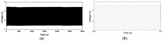 As shown in Figure 8a, the repeatability of a single sensing cell is verified by a measurement of dynamic transient responses for 7200 cycles. The sensing cell was repeatedly pressed using the piezoelectric actuator driven by a periodic square wave of 2 Hz, and the total duration of this measurement is one hour. Figure 8b is a 20-cycle subset of Figure 8a. This test utilizes a constant current source to convert the pressure-induced resistance variation to voltage signals. The raw data is recorded by a time step of 0.01 s and thus the whole test of 7200 cycles contains about 360,000 data points. The measurement results show that the repeatability of the fabricated sensing cells is quiet decent, where the cycle-to-cycle variation is approximately lower than 5%.