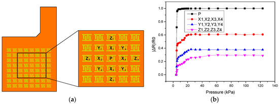 Figure 9a shows a schematic for evaluating the crosstalk effect of the proposed sensing array. An external pressure force is applied to point P in this measurement, and the resistances at point P and the surrounding sensing elements points X, Y, and Z are measured independently. Figure 9b shows the measured results of resistance variation. When the external pressure applied at the point P grows, the resistance of point P decreases sharply. Because of the deformation at point P, the average resistance variation at the nearby points X, Y, and Z increases under zero applied pressure, and this crosstalk effect becomes weakened as the distance from point P increases.