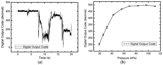 Measurement results of the prototype module in pressure detection: (a) Measured step transient response; (b) Measured characteristic of digital output code versus pressure.