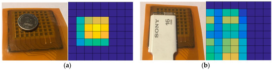 (a) Pressing test with a button battery and its corresponding force image; (b) Pressing test with a USB drive and its corresponding force image.