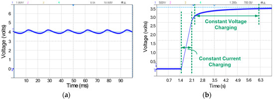 Measurement results of the power management unit: (a) Measured output waveform of the RF-DC converter; (b) Measured waveform of charging progress by the on-chip charger.