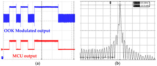 Measurement results of the MICS band transmitter: (a) Measured output waveforms of MCU and transmitter; (b) Measured transmitter output spectrum.