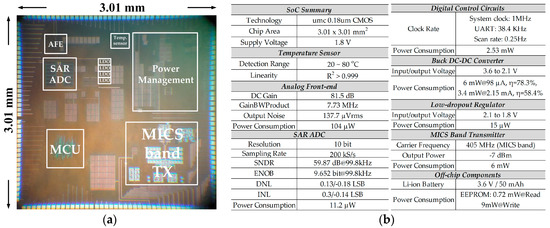 (a) The micrograph of the proposed SoC; (b) Measured performance summary.