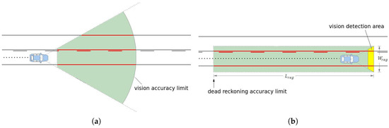Typical computer vision systems for autonomous vehicles or ADAS (advanced driving assistance), use camera to detect lane markings in the medium range (up to 30 m or 40 m) in front of the vehicle, as shown in Figure 1a. The further away the visual information is from the vehicle, the smaller is its confidence, specially because the variation of the pitch angle, vertical curvature of the ground, or occlusions caused by other vehicles. Thus, the approach presented in this paper avoids this problem by using a visual short-range lane marking detector, and dead reckoning system, that allows to build an accurate and extended perception of the lane markings in the back of the current vehicle’s position. This means that as the vehicle moves, the lane markings detected are displaced backwards so that a back lane mark registry (BLMR) is constructed. The principle, illustrated in Figure 1b, is similar to that used by a document scanner to construct a 2D image from an 1D light sensor array (1D CCD).