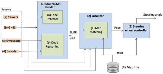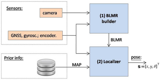 Figure 2 shows the sensors and software architecture developed both for map building and autonomous driving. When the system is operating to build a map, only Module 1 is used and its output is a map. When operating in precise localization mode or autonomous driving, all the modules are used. In this case the output of Module 1 is the BLMR. The details will be better explained in Section 5.1.