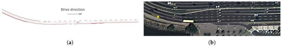 Example of map build by the MAP/back lane mark registry (BLMR) builder module: (a) the built lane marking map; (b) satellite image of the corresponding road section.