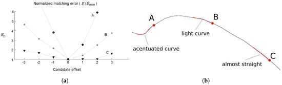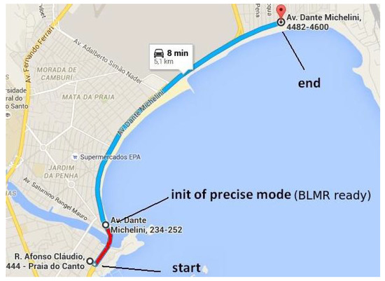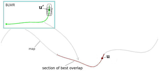 Module 2 is responsible for the localization of the vehicle in the map. The information from GNSS is used only to calculate the approximated initial localization. Once the vehicle knows its approximated localization, and the BLMR data is available, Module 2 applies a technique of map-matching and filtering to calculate the localization with higher accuracy. The principle of precise localization, illustrated in Figure 4, is to search in the map for a section with similar geometric characteristics. As this process is subject to error, additional filtering is applied. The filter also predicts the variation of localization, based on the information provided by the gyroscope and the odometer. Details of the operation of this module are presented in Section 5.2.