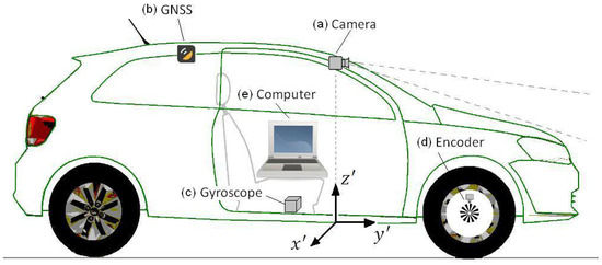Figure 5 presents the prototype vehicle, a VW GOL 1.6, and its hardware setup. This vehicle was used in the first part of the experiments with the objective of determining the localization accuracy. The hardware installed consists of: (a) camera, (b) GNSS receiver, (c) gyroscope, (d) encoder, and (e) computer.