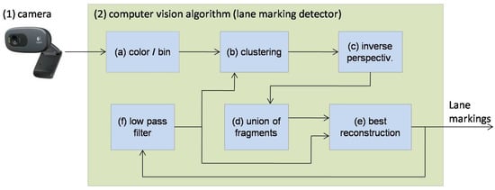 The camera is a standard USB WebCam mounted in front of the rear-view mirror for capturing front images, as presented in Section 2.2. The frames, captured in the resolution of 640 × 480 pixels, are sent to the vision algorithm for lane marking detection. The computer vision algorithm (Figure 6) runs in the same computer of the prototype vehicle together with other processing tasks like dead reckoning, localization, and steering command. Module (a) converts the image from color to gray-scale and then to binary image, classifying the pixels that belongs to a lane mark. Module (b) groups the neighboring pixels. Module (c) calculates, through a perspective transform, the “sky view” of the information, named fragments. Module (d) groups fragments that corresponds to the same lanes makings. Module (e) analyses the result of (d) and selects the best group, according to a quality criteria. Finally, Module (f) filters the instantaneous measurements to feedback a guide line to Module (b). Details of the vision algorithm are presented in the following sections.