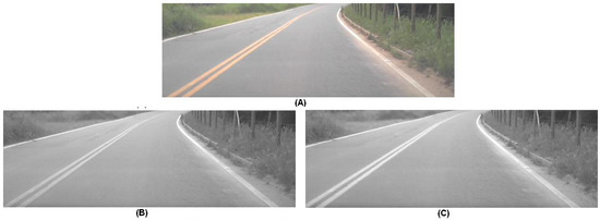 Figure 7 shows a comparative result of the standard conversion and our approach. The ratio between intensities of the yellow color and the background color (asphalt) increased on average 9% when using our proposed method. This enhanced the capacity of detecting the yellow lanes without changing the response to the white lanes.