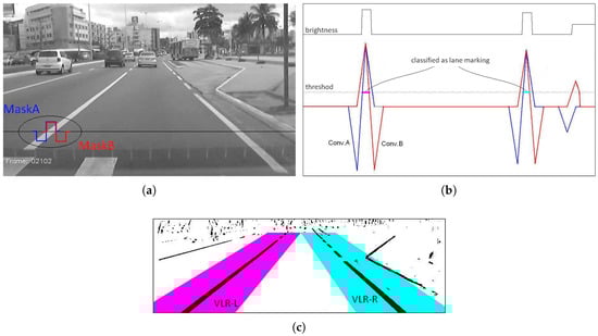 Example of pixels classification. (a) Original gray-scale image and masks; (b) Processing of a line; (c) Final binary image with valid lane regions.