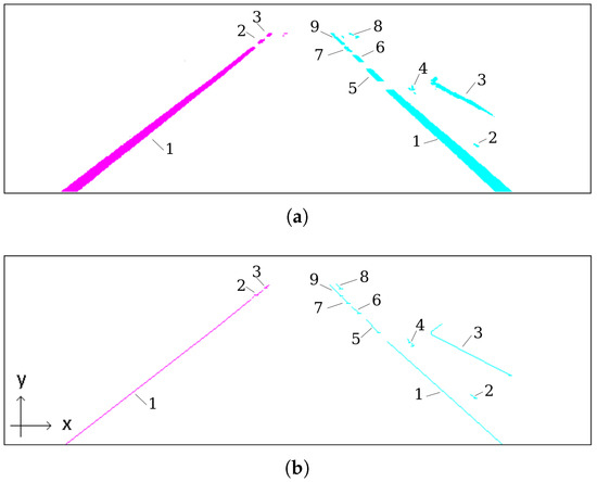 After the pixel classification, the resulting binary image, as the one presented in Figure 10a, contains two regions of pixels clusters, one for the left lane marking and other for the right lane marking. Each blob, with a minimum height () has its mean line calculated to form a fragment (skeleton) representation, stored as an array of pairs . Figure 10b shows the fragments corresponding to the blobs of Figure 10a.