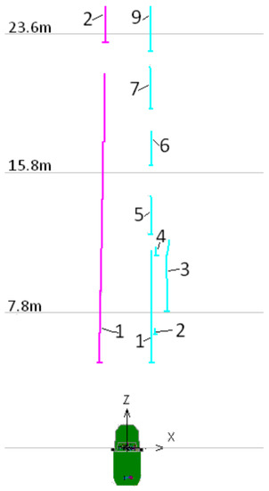 As mentioned before, the accuracy calculation and analysis were performed only after the BLMR was ready. Figure 31 shows the violin plots (vertical histograms) of the absolute value of the lateral error of the target point (LETG), obtained from each individual trip (1–6) and for all trips. Each violin plot represents the error distribution of our autonomous driving variable . In the Figure, the crosses indicate the average error, and the dots indicate the maximum error for each trip. All trips have an average error below 10 cm, and the first two trips resulted in an average error lower than 5 cm. Considering all trips, the average error is 5.7 cm while its value remains under 29.0 cm in 99.9% of the route. For the angular errors, computed according to , we have and respectively.