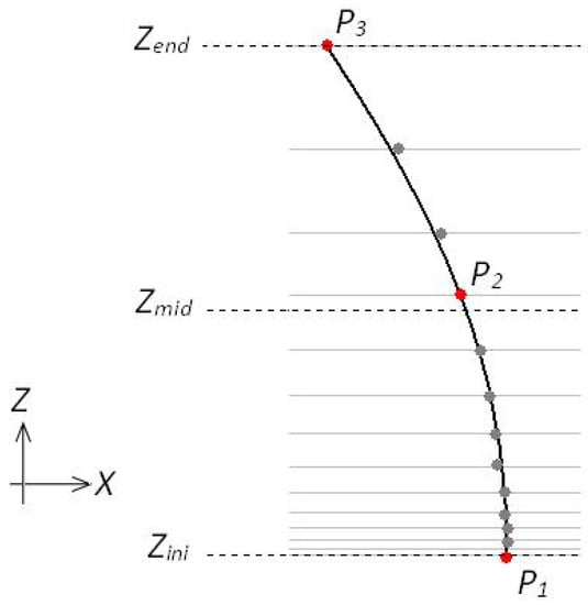 To represent the geometric information of a fragment, including possible curvature, we chose a second degree polynomial. The polynomial representation is very convenient because it permits fast evaluation of fragments (extrapolation), to determine possible connection with other fragments. The conversion is straightforward and uses three points of the fragment, , and , to calculate the three coefficients of the polynomial. Figure 12 illustrates the method. Note that due to non-linear transformation of the , the increments of Z are not linear. The point is the point immediately above the center. The coefficients of the polynomial and its interval of validity ( and ) are stored on a data structure that will be used latter to test for fragments connections, as explained in next section.