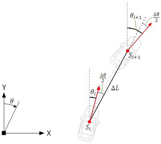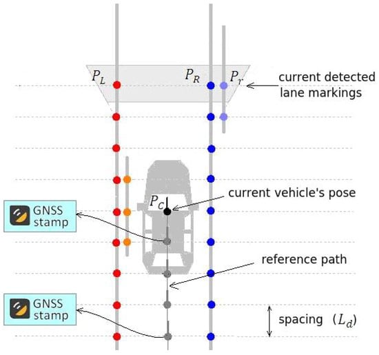 Module 3 in Figure 2 is responsible for computing the steering angle. This module uses information from the vehicle’s current pose and the map to calculate the lateral deviation from the lane’s center, with respect to the vehicle longitudinal axis (), and compute the necessary steering angle to keep the vehicle on the reference path. This principle is shown in Figure 29 and was used in [35,60].