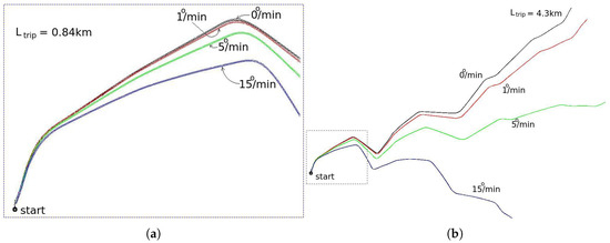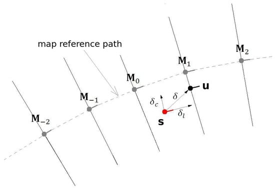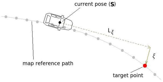 The distance , used in the analysis, is fixed and was chosen considering the speed of 60 km/h for the mapped section, and the time-to-reach of 1.5 s. The target point is taken directly from the map reference path (Figure 29), choosing the one whose distance is closer to .