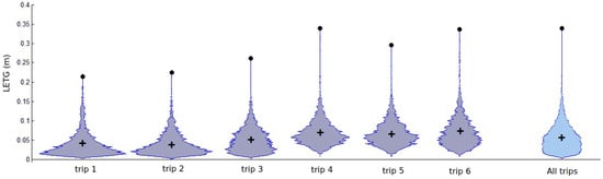 Violin plots (vertical histograms) of the absolute value of the lateral error of the target point (LETG). The crosses indicate the average error, and the dots indicate the maximum error for each trip.