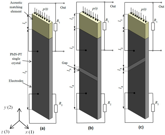 Piezoelectric strip-like receivers operating in a transverse-extension mode: (a)—with continuous electrodes; (b)—with two rectangular electrodes—case A; (c)—with two non-rectangular electrodes—case B; p(t) is the incident acoustic pressure.