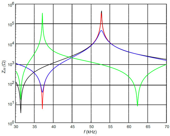 Simulated electric input impedance of the PMN-32%PT 20 × 5 × 1 mm3 piezoelement without the matching strip with continuous electrodes (black) and two pairs of rectangular electrodes (90°, model A) with external resistor R2 connected to the bottom electrodes: R2 = 1 MΩ (red); R2 = 50 kΩ (blue); R2 = 1 Ω (green).