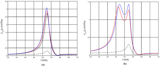 Simulated frequency responses of the PMN-32%PT receivers at the output of the top rectangular electrode (case A, R1 = 50 kΩ, R2 = 50 kΩ) with the matching strips the length of which is l1 = λ/4 at the antiresonance frequency fa = 53 kHz (a) and fa = 46 kHz (b) made of different AIREX type materials: black—C70.75; red—C70.130; blue—T10.100. Black dashed line—without the matching strip.