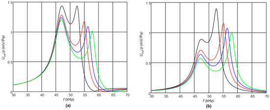 Simulated frequency responses of the PMN-32%PT receivers on the top (a) and bottom (b) pairs of electrodes with different gaps between electrodes and the matching strip made of AIREX T10.110 the length of which is l = 5.7 mm, R1 = R2 = 50 kΩ: 1 mm—black color, 2 mm—red, 3 mm—blue, 4 mm—green.