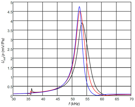 Simulated influence of electrodes dimensions on the frequency response observed on the top electrodes (AIREX T10.110, R1 = 1 MΩ, R2 = 50 kΩ): black color—case B1 (λ/4 = 4.9 mm); red—case B2 (λ/4 = 5.0 mm), blue—case B3 (λ/4 = 5.1 mm).