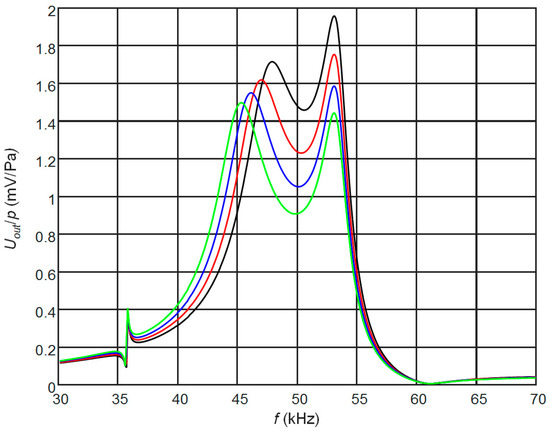Simulated frequency responses of the PMN-32%PT receivers at the output of the top non-rectangular electrode (case B2, 45° gap) with the λ/4 length matching strips (AIREX T10.110), R1 = R2 = 50 kΩ, adjusted to different frequencies: black—fs = 47.6 kHz, l1 = 5.6 mm; red—fs = 46.7 kHz, l1 = 5.7 mm; blue—fs = 45.9 kHz, l1 = 5.8 mm, green—fs = 45.2 kHz, l1 = 5.9 mm.