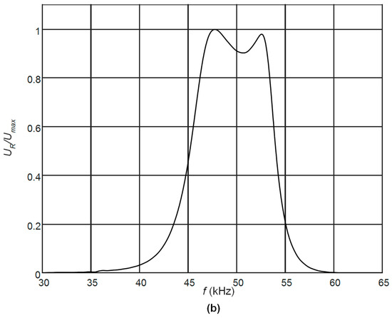 Uniformity of the frequency responses can be improved selecting the proper length of the matching strip l1 and adjusting electromechanical damping by means of the resistor R2. In this case, a trade-off between the sensitivity and bandwidth of the receiver can be obtained (Figure 10). The results presented in Figure 10 show that in this case a quite wide bandwidth ∆f = 9.2 kHz or 18.4% with respect to the central frequency 50 kHz is obtained. For air-coupled ultrasonic transducer it is good result.