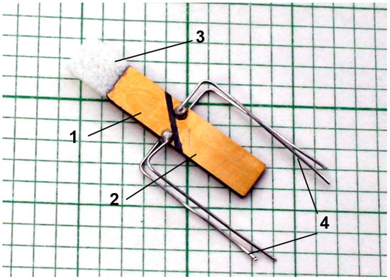 The experimental investigation of the proposed air- coupled ultrasonic receiver (Figure 1c) was performed using PMN-32%PT crystals plates with <011> cut and [001] poling direction from the H.C. Materials Corporation (HCMC, Bolingbrook, IL, USA). The strips-like piezoelectric elements of necessary dimensions 20 × 5 × 1 mm3 were cut of the 20 × 20 × 1 mm3 poled PMN-32%PT crystal and were coated by gold electrodes. The necessary non-rectangular shapes of electrodes were obtained by the “aqua regia”, e.g., nitrohydrochloric acid etching technique [47] of the 45° gaps whole electrodes. The piezoelectric PMN-32%PT receiver element prepared for experimental investigation is shown in Figure 12.