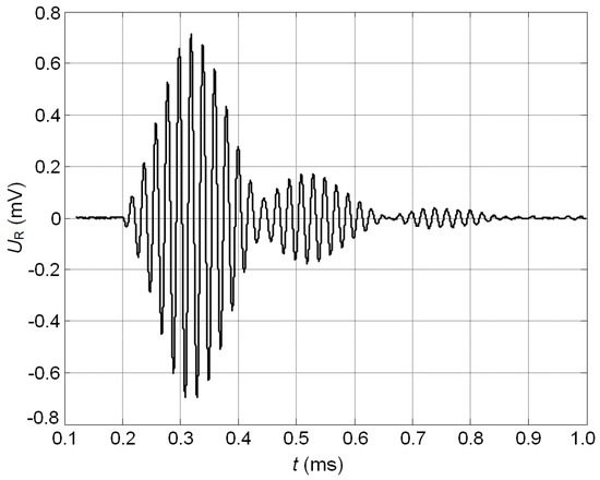 Waveform of the ultrasonic signal at the output of the receiver with two non-rectangular electrodes (gap between electrodes at 45°, case B), when the acoustic excitation signal was the five periods sine burst with the acoustic pressure amplitude of p = 1.0 Pa.